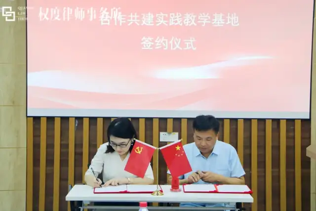 随后,权度律所赵芳主任和湖南财院会计学院副院长曾峻代表双方签署合作协议,并完成揭牌仪式。在仪式的最后,双方与会人员进行合影留念,共同庆祝权度律所与湖南财院会计学院实践教学基地正式成立。